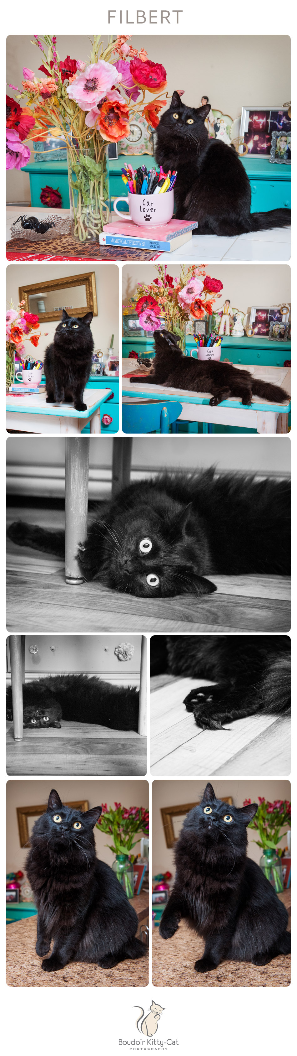 Since this project was for Williamson County Animal Center, I’m focusing a little bit more on Filbert’s adoption story, though all three kitties are loved equally. The day Kate met Filbert she didn’t intend on adopting a cat. At the time she was a guardian to her cat Scotchy and was living a busy life. Her visit to the shelter was October 7, 2014, and was simply to pass some time while her school application was being processed next door at Columbia State Community College. Well you know what they say about plans. Plans change! When Kate laid eyes on Filbert something in her heart shifted! Filbert, who shared the cage with his siblings, Pecan, Peanut, Almond (all named after nuts) was a terrified, little, black ball of fluff hiding in the very back of his cage. Filbert was so small, fragile, and precious. Moments later Kate found herself in the visitation room with him. In minutes Filbert stole her heart with his big yellow eyes and cuddly nature. Adoption paperwork was filled out on the spot and the deal was sealed that day for Kate and Filbert!